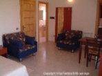 Woon/Slaapkamer: Hotelbedden (een dubbel of 2 persoons) twee nachtkastjes met leeslampjes, Hanglegkast, 2 eenpersoonsbedbanken, Bureau met stoel. tafel met 4 stoelen. Airconditioning/ verwarming.
