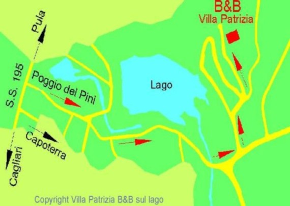 Si lompit in Castedhu de Aeroportu, Portu, S.S.131 o S.S.125De Castedhu, pigai la S.S.195 conca a PULA. A su km 11,000 dhoi est sa stressiada a manu dereta po CABUDERRA. Fatus 50 m, sagatat sa stressiada a manu manca po POGGIO DEI PINI/PAULIARA.